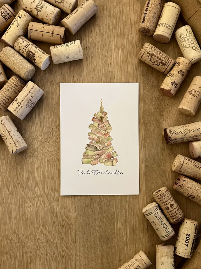 Ein Weihnachtsgruß, der Freude schenkt und zum Schmunzeln einlädt: Diese Karte zeigt einen festlichen Weihnachtsbaum aus Weinflaschen – ein stilvolles Motiv für alle, die Genussmomente zu schätzen wissen. Ob zum Weinpräsent oder als liebevolle Beigabe – mit dieser Karte wünschen Sie „Frohe Weihnachten“ auf ganz besondere Weise.